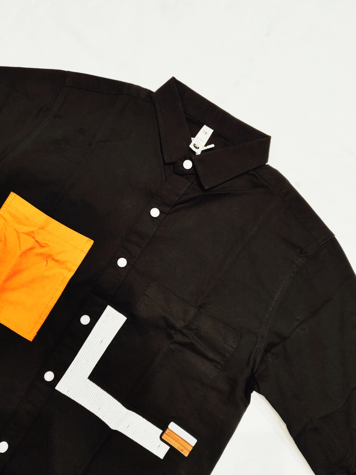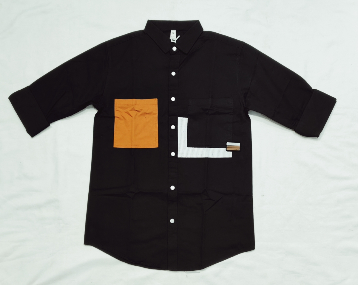 Step into contemporary streetwear with this black casual shirt featuring a bold contrasting orange front pocket and geometric patchwork design. Made with premium cotton-blend fabric, it provides breathability, comfort, and durability. The white linear patchwork adds a modern edge, while the snap button closure enhances convenience and style.