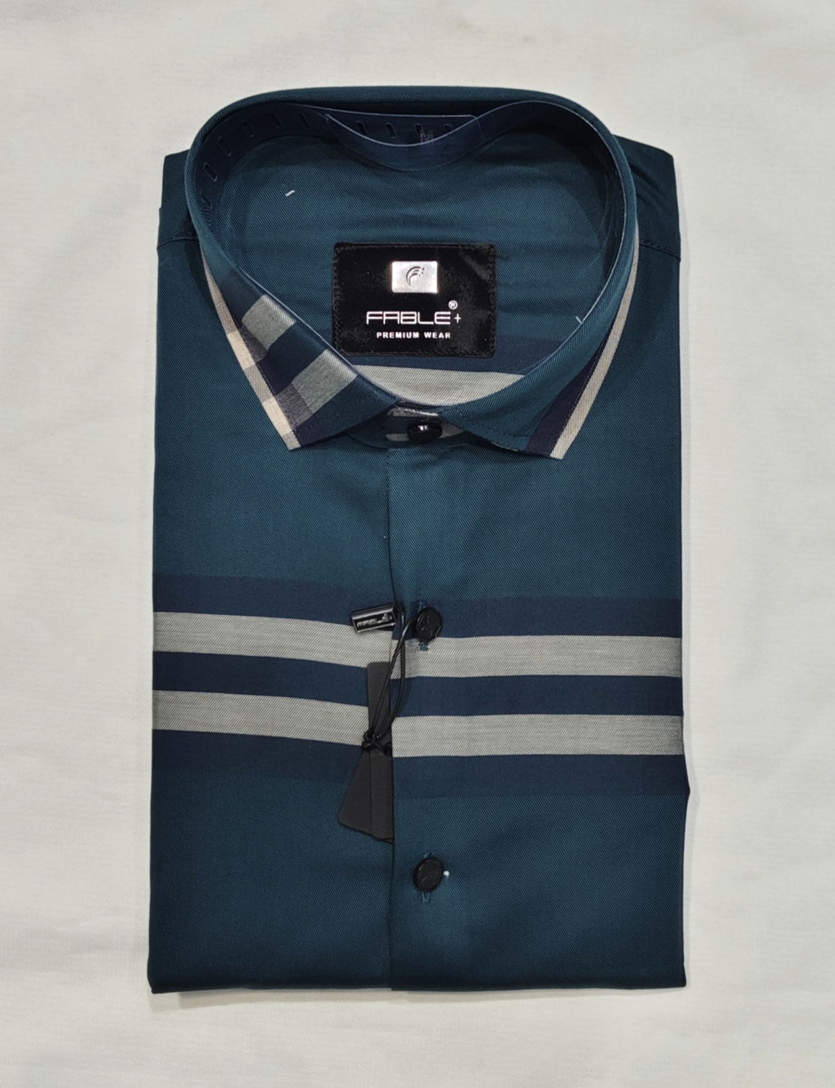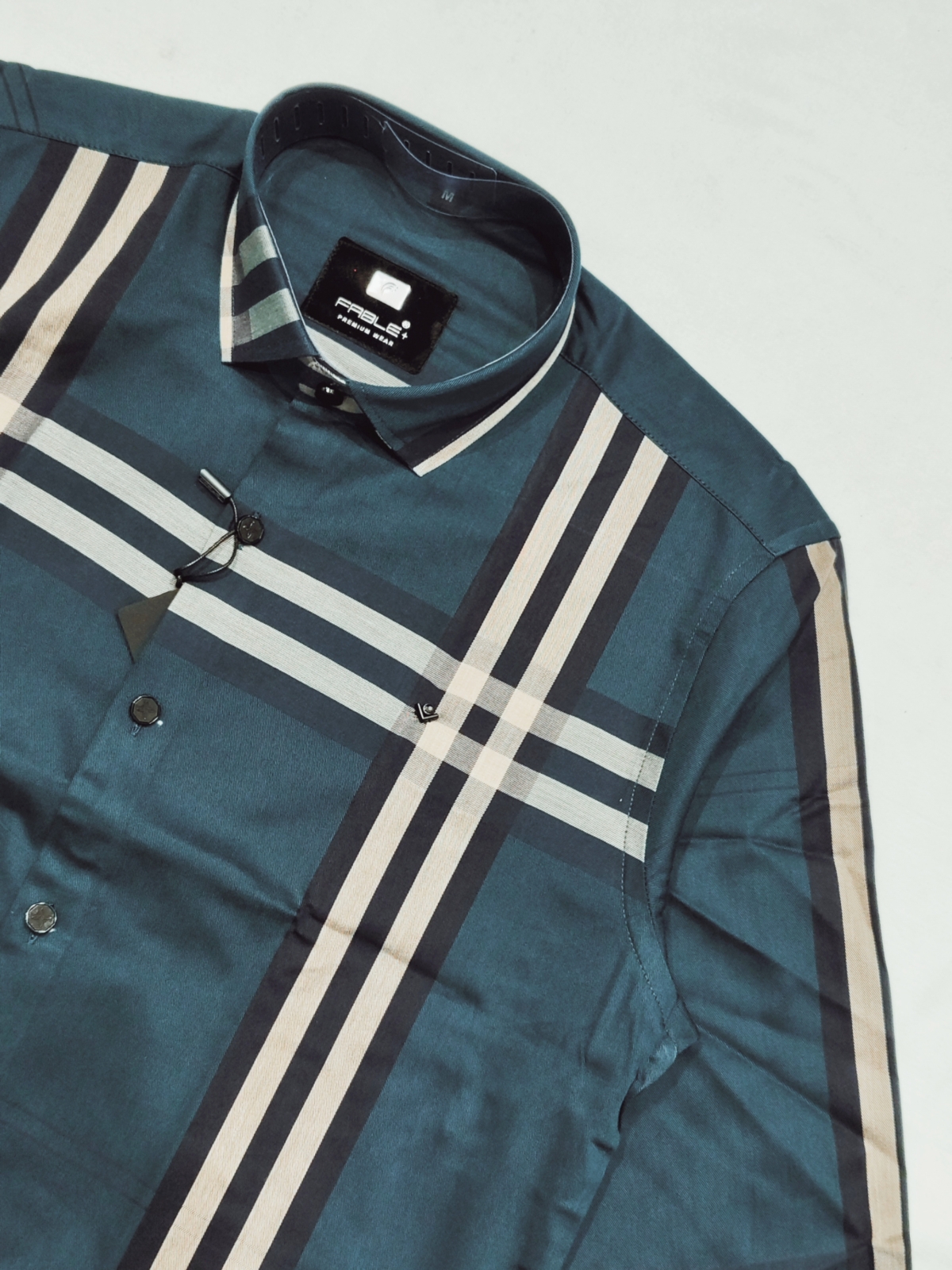 Add a touch of contemporary flair to your wardrobe with this teal checkered pattern shirt, a blend of modern design and classic appeal. Made from high-quality cotton-blend fabric, it ensures softness, durability, and day-long comfort. The shirt features bold cross-check patterns in beige and navy, making it a standout piece for casual and semi-formal looks. Designed with a classic collar, button-down front, and regular fit, it’s perfect for men who love effortless yet striking style.