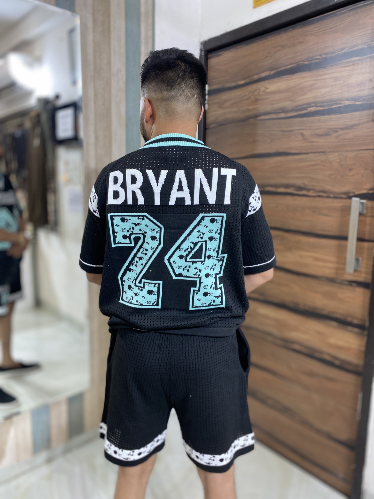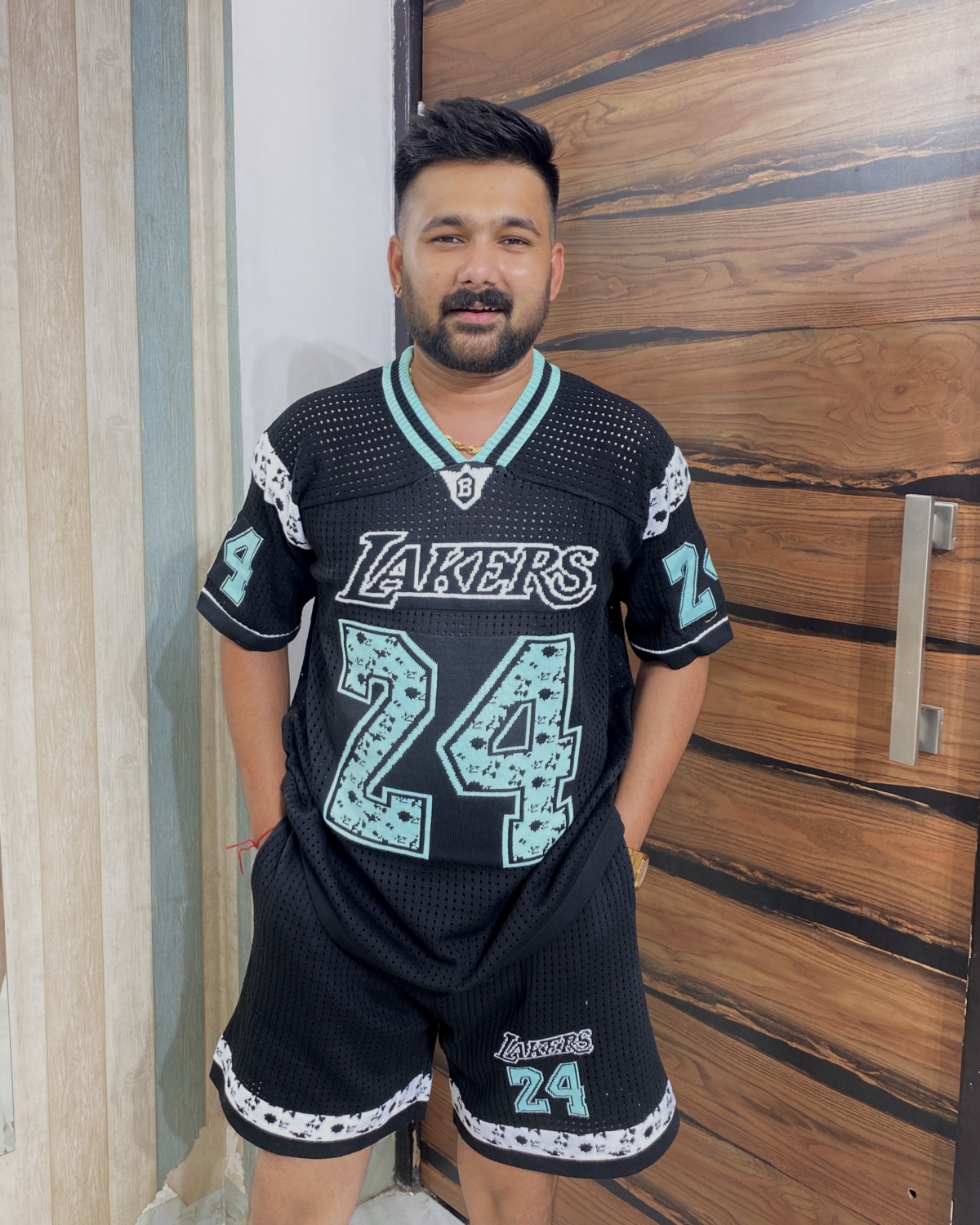 This image showcases a men’s stylish co-ord set inspired by basketball legend Kobe Bryant. The outfit features a matching t-shirt and shorts in black with teal and purple accents. The t-shirt has “LAKERS” printed on the front and the number “24” prominently displayed, while the shorts also carry the number and Lakers branding, reflecting an athletic streetwear vibe. Ideal for casual wear, sports events, or fan merchandise collections, this co-ord set combines comfort with bold style.