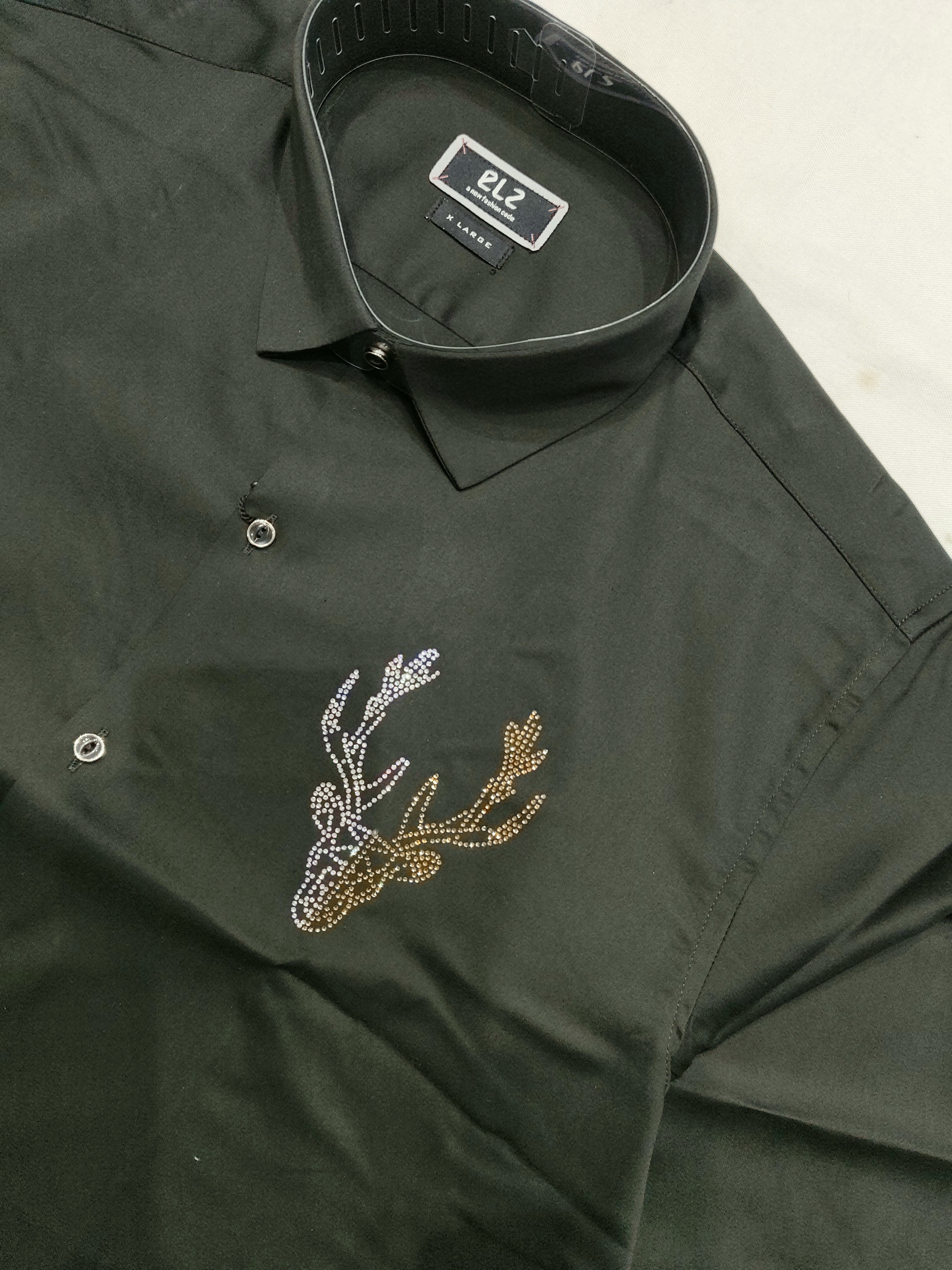 Make a refined yet bold statement with this deep forest green full-sleeve shirt, featuring a premium finish and a distinctive multicolor rhinestone deer motif on the chest. Designed for individuals who embrace elegance with a touch of flair, the shirt combines a sleek, tailored silhouette with durable craftsmanship. The soft, breathable fabric ensures comfort, while the sparkling embroidery adds a unique and stylish edge, making it perfect for parties, dinners, or high-fashion events.